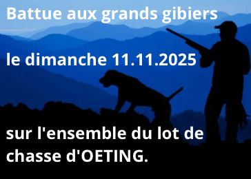 Une battue aux grands gibiers sera organisée le mardi 11 novembre 2025 sur l’ensemble du lot de chasse d’OETING.
