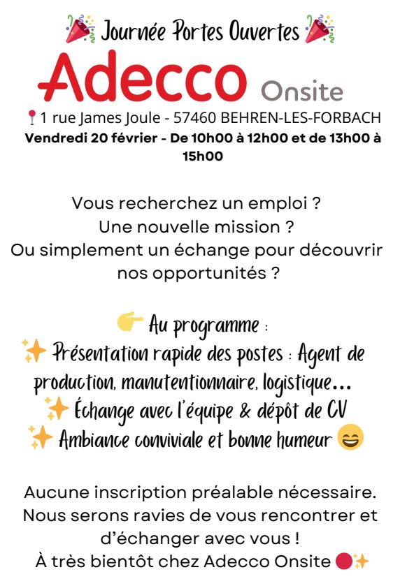 Venez à la Journée Portes Ouvertes organisée par Adecco Onsite, situé au 1 rue James Joules,